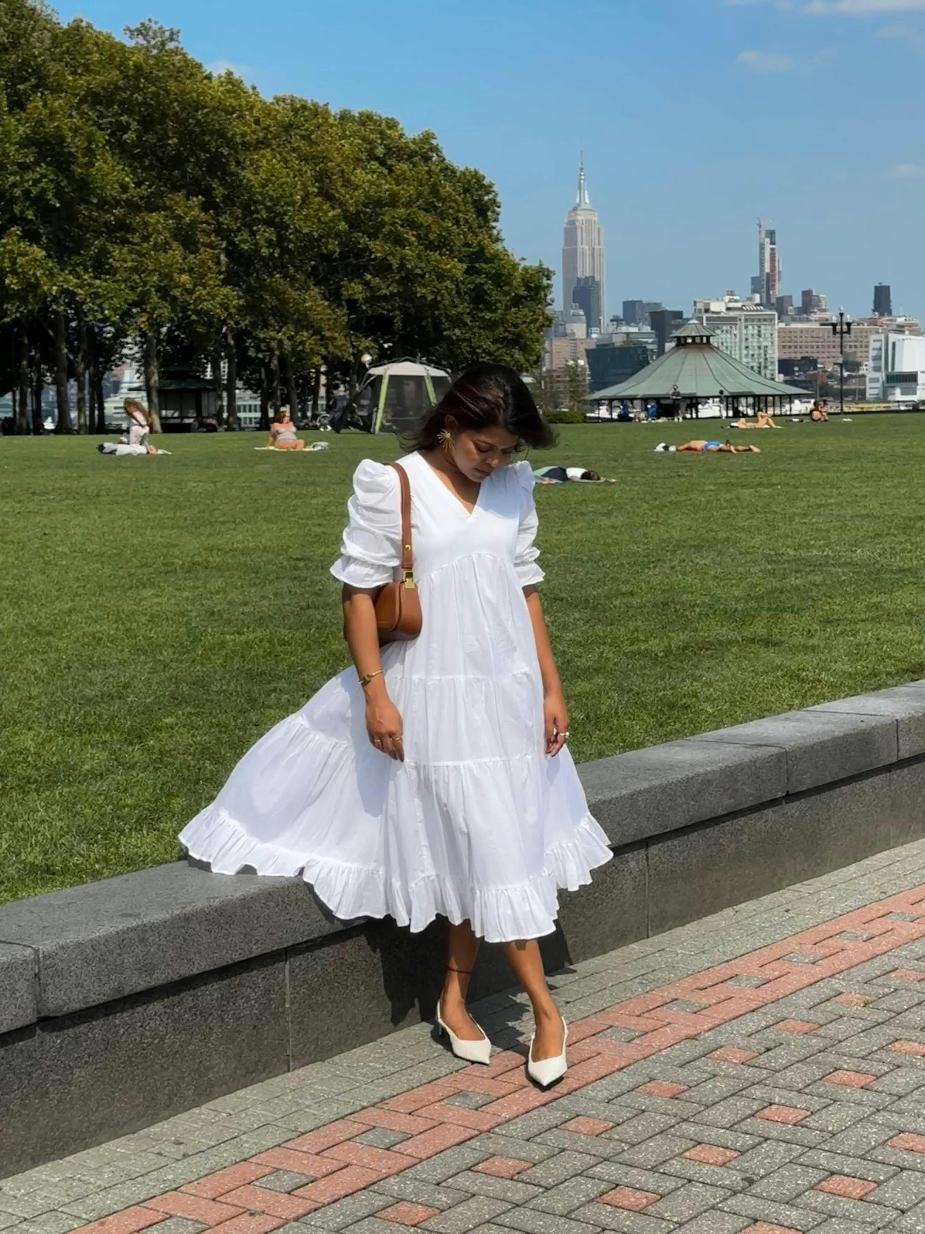 Crafted from lightweight, breathable cotton fabric, it features a flattering A-line silhouette, a soft V-neckline, and delicate detailing for a fresh and feminine vibe. Perfect for picnics, beach strolls, or casual outings, pair it with sandals and a straw hat for an effortlessly chic summer look.